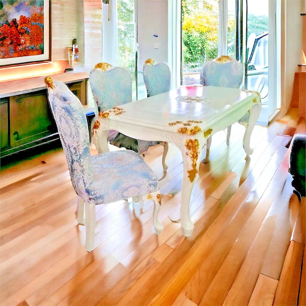 Cette salle à manger complète en style Louis XV séduit par son mariage harmonieux de bleu, blanc et bronze, qui apporte une élégance intemporelle à votre intérieur. Au cœur de l’ensemble, la table se distingue par son plateau protégé d’une vitre de verre d’1 cm d’épaisseur, alliant modernité et respect du bois noble.