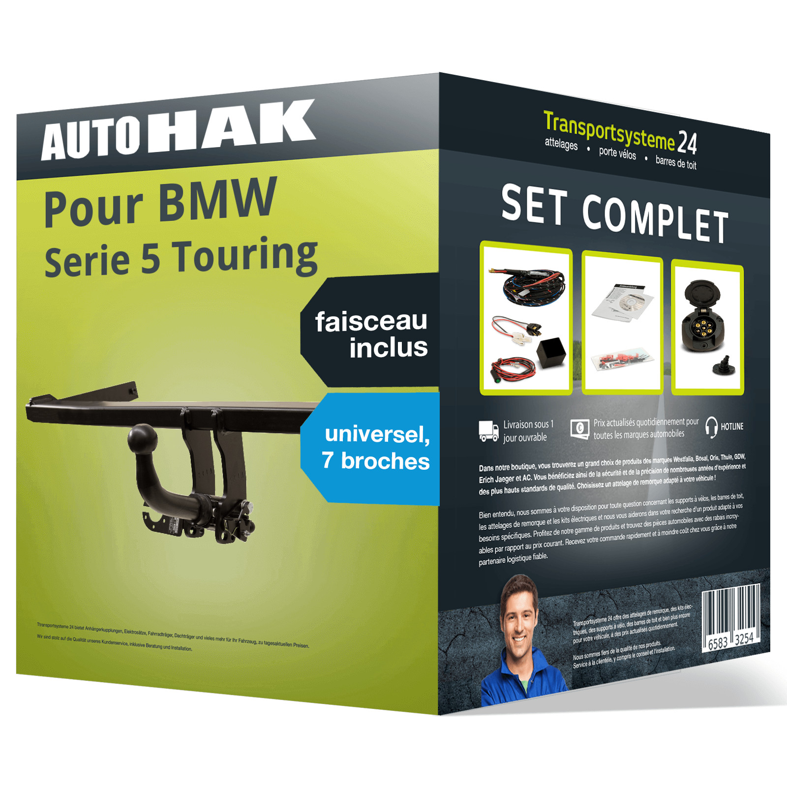 PACK COMPLET pour BMW Serie 5 Touring 03.2004 - 12.2010, composé d'un attelage rotule démontable Auto Hak et d'un faisceau 7 broches universel TowTec. D’autres informations produit importantes consultables dans la notice de montage - veuillez cliquer sur le lien!.
