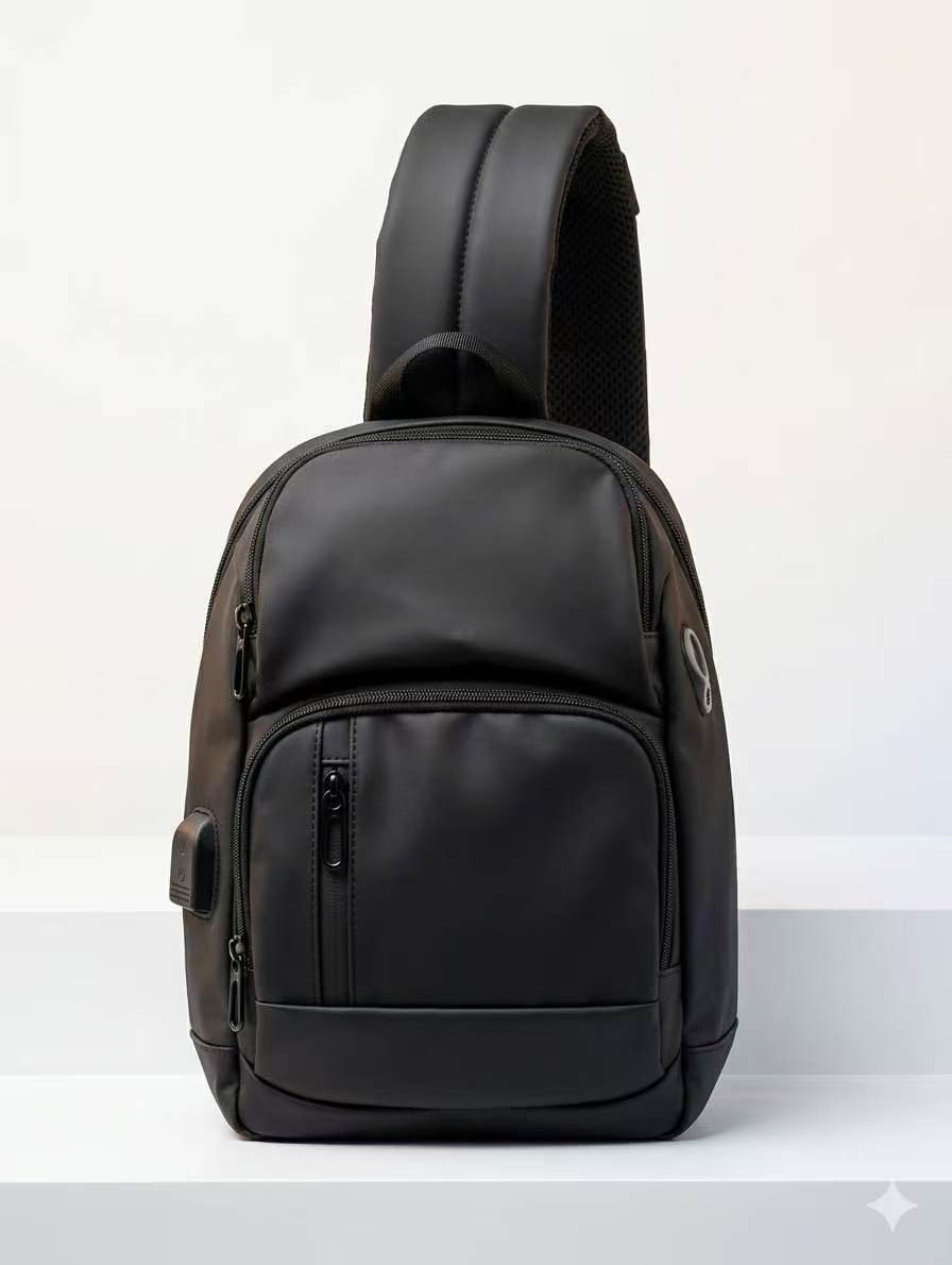 Sac de poitrine antivol en cuir synthétique imperméable (31x20x10cm). Texture premium, dos respirant, port USB et sortie écouteurs intégrés. Plusieurs compartiments sécurisés. Idéal voyage et sport. Chic, compact et durable.