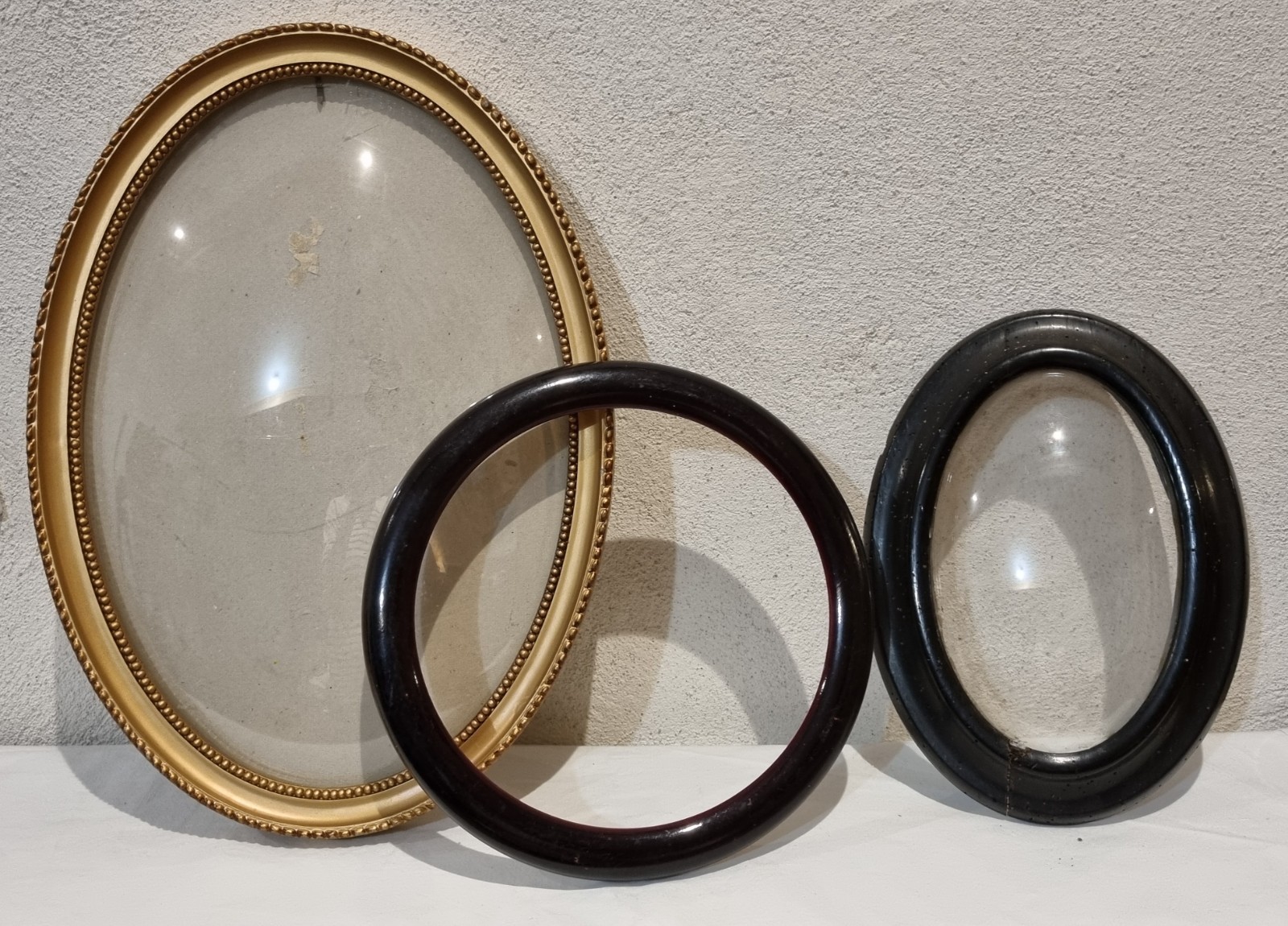 CADRE OVALE bois noirci napoléon III, fentes, manque de bois/ verre bombé / 28 x20 cm (au plus large). CADRE OVALE, plastique doré, verre bombé/ 42x30 cm/ au dos vis pour ouvrir et insérer ce que l'on désire.