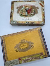 Quelques usures et taches sur la pipe et le coupe cigare. Celui-ci est fonctionnel. Couvercle à charnière décoré sur le dessus d'un cigare et d'une feuille de tabac. Ils peuvent présenter des imperfections dues à l’âge.