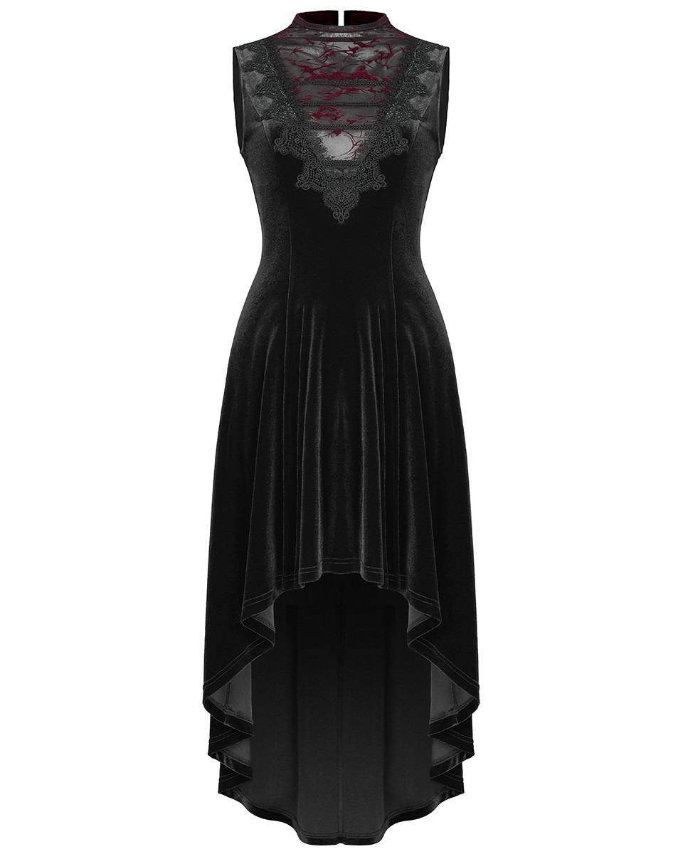 Punk Rave Femme Gothique Lolita Longue Hi Low Robe de Soirée Noir Rouge Velours Dentelle Superbe nouvelle robe de soirée rétrogothique romantique de Punk Rave. Fabriqué à partir de polyester velouté noir de jais doux et extensible dans un design gothique foncé classique Corsage sans manches magnifiquement ajusté avec col boutonné et laçage ruban réglable au milieu du dos Découpe en V profond sur le buste avec empiècement en mesh transparent avec imprimé floqué en velours rouge Entouré d'une bordure en dentelle guipure brodée complexe Jupe élégamment évasée avec un superbe ourlet haut-bas coupé de la longueur de la mi-cuisse devant à la longueur du mollet à l'arrière 93 % polyester 7 % élasthanne. Informations sur les tailles.