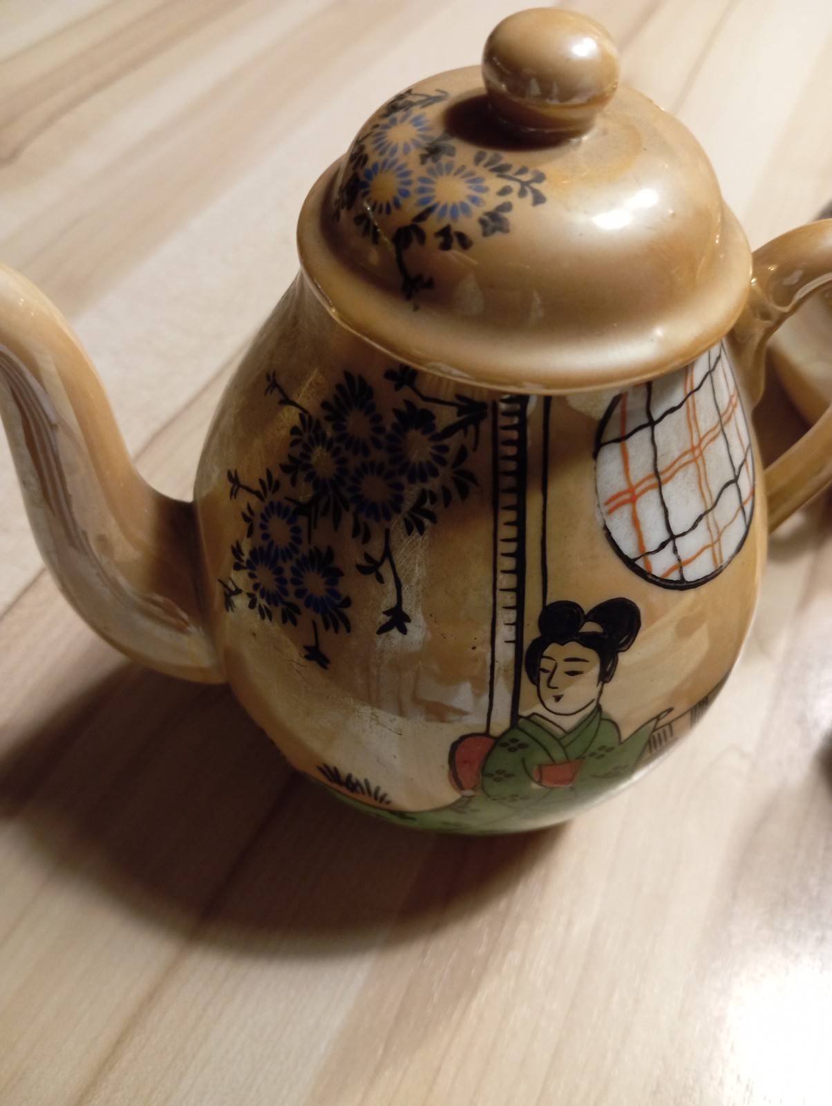 Magnifique service à thé japonais en porcelaine, décoré de motifs traditionnels avec personnages et fleurs, dans de belles teintes chaudes (ocre / doré). 🍵 Service à thé japonais ancien – Complet et en très bon état.