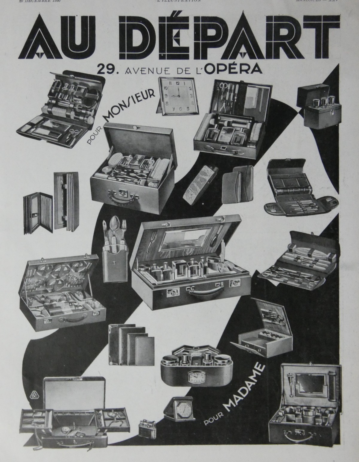 PUBLICITÉ DE PRESSE 1930 AU DÉPART MALETTE ÉTUI BRIQUET RÉVEIL PENDULE