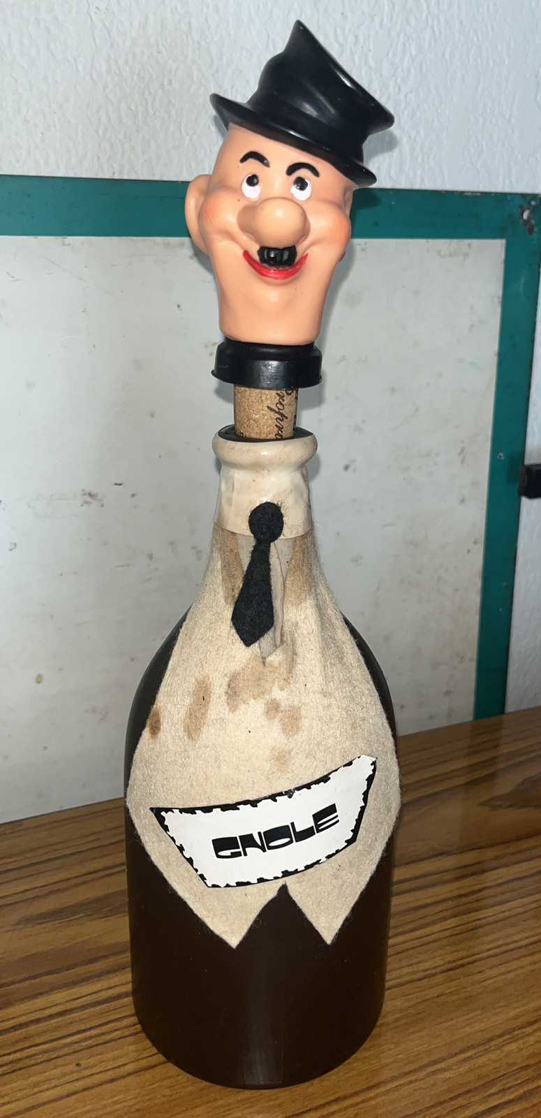 RARE ANCIENNE BOUTEILLE CARAFE EN VERRE GNOLE avec BOUCHON TETE CHARLOT en plastique dur , bouteille peinte et habillée tissus .. KITCH RÉTRO. Envoie monde ok ✅ 📦 🌍