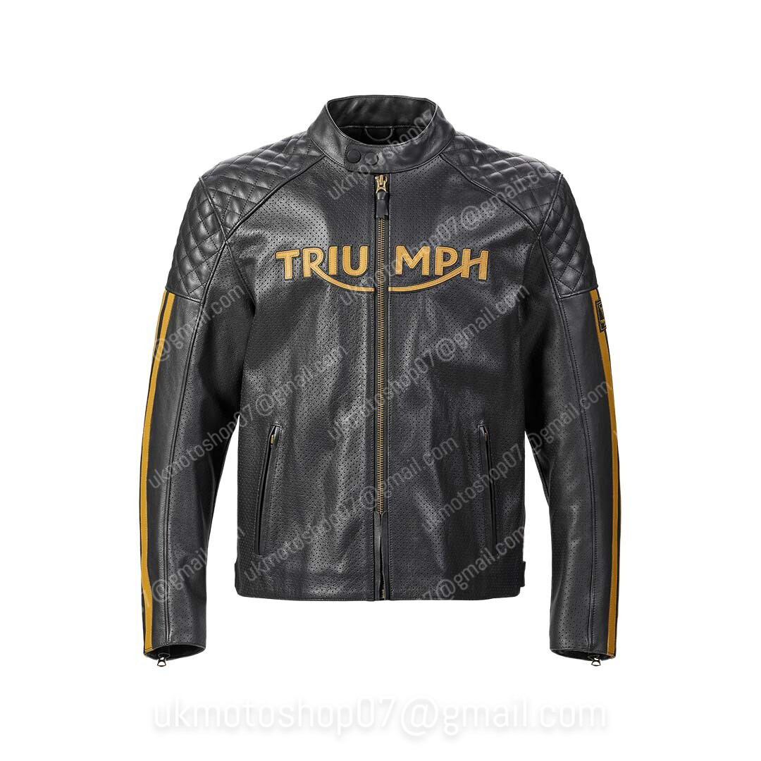 Tout Neuf "TRIUMPH"Veste en Cuir de Moto. Veste Tableau des Tailles. Cuir génuine Top Grain Cuir doux 1,1-1,3 mm. Poignets et boutons-pression d'origine YKK. 5 armures approuvées CE. Point de fil Kevlar.
