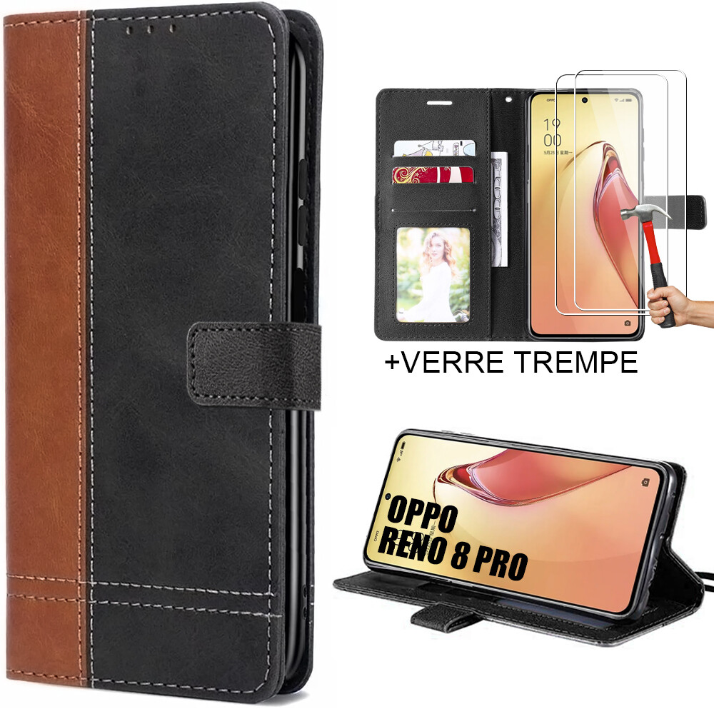Coque Cuir PU OPPO A54 A74 A93 5G Reno 8 Pro Lite Find X5 Pro + 2 Verres Trempés