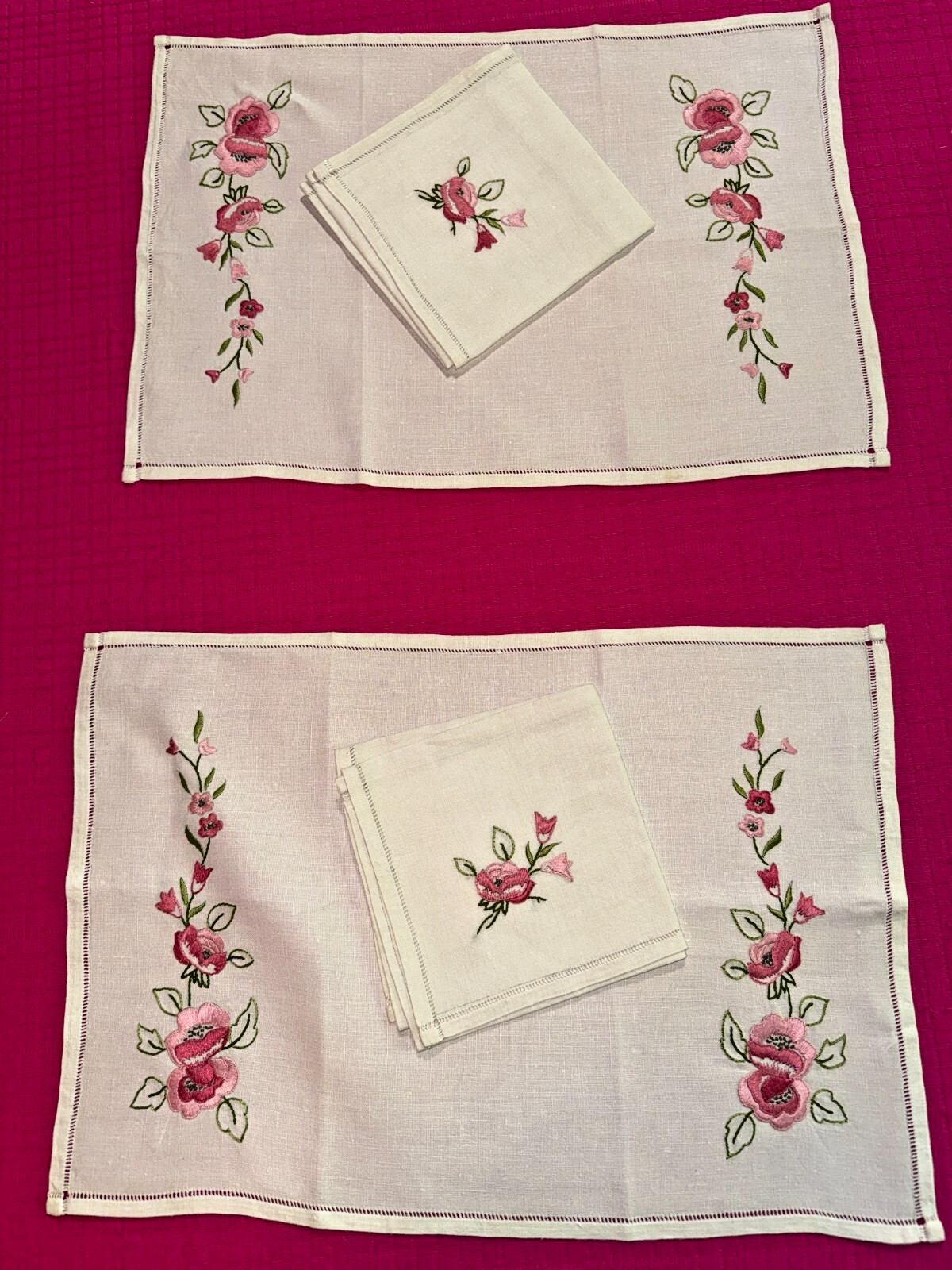 2 sets de tables + 2 serviettes de table brodés main, rétro