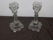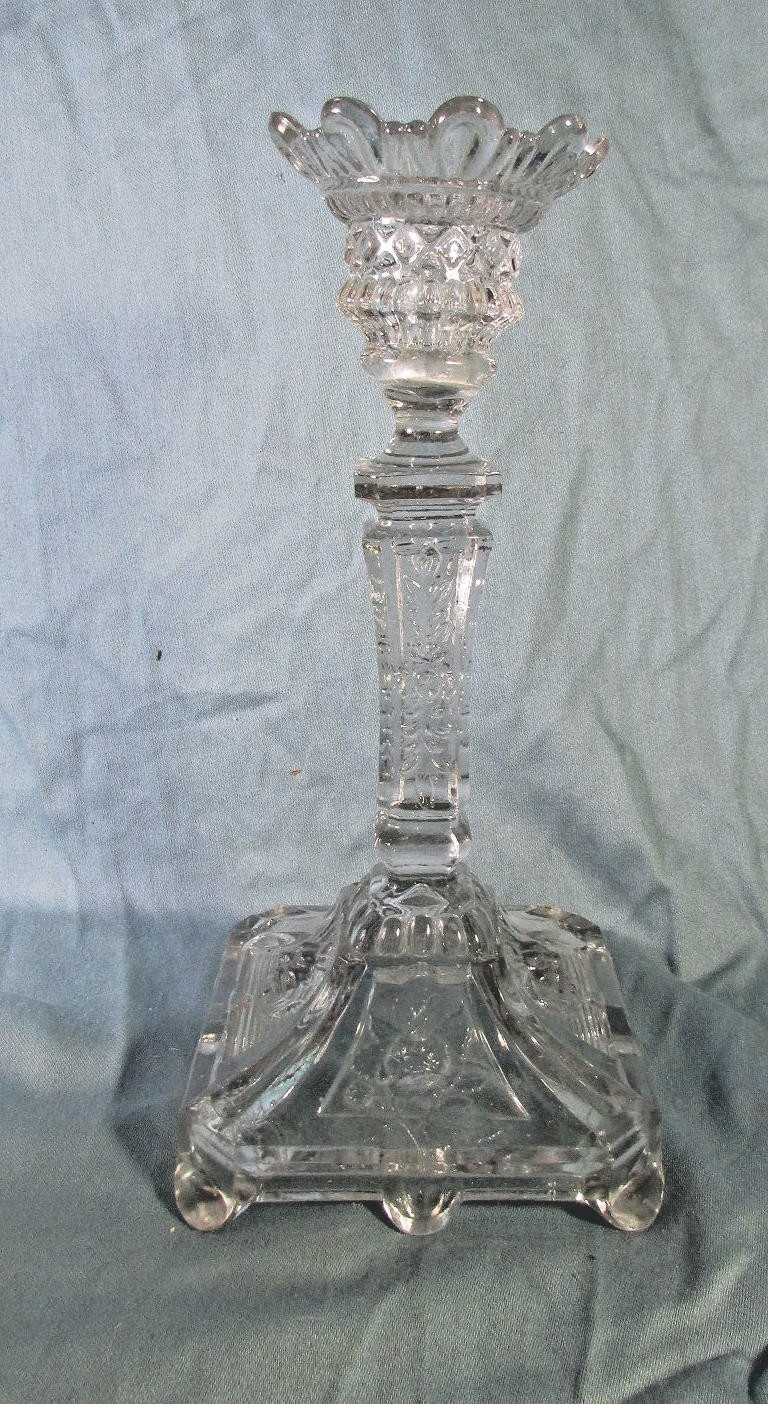 ( Portieux??). Joli bougeoir en verre pressé moulé transparent. Hauteur 25,5 cm. très stable grâce à sa base de 12,5 x 12,5 cm.