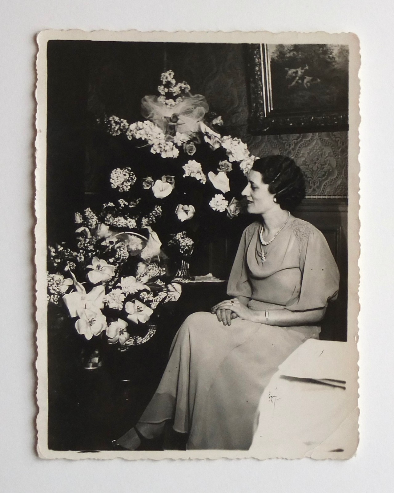Femme tenue soir, chic élégante fleurs profil - Photo ancienne snapshot 1936