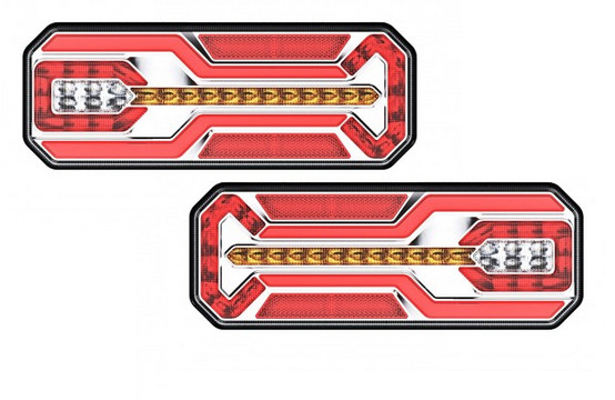 Clignotants dynamiques. 2x feux arrière LED (ensemble) 12-24V. Feux de recul. Feu arrière NEON. Feu de freinage. Feu antibrouillard arrière. - Distance entre les vis : 150 mm. - 350 x 131 x 35 mm (LxlxP) avec câble environ 1 m.