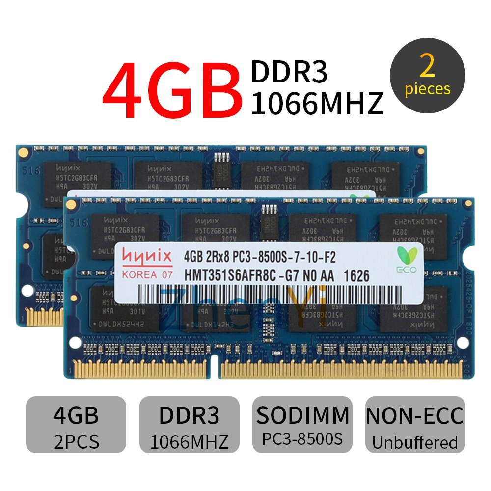 Image à titre de référence uniquement. Item Discription: Type: mémoire d'ordinateur portable SO-DIMM DDR3 Fonction: non-ECC Fréquence: PC3-8500S 1066 MHz Spécifications du module: 204pin Capacité de mémoire: 4 Go Tension de la mémoire: 1.5V Garantie: Garantie à vie Contenu du paquet: 8Go 2x 4Go 1066Mhz Laptop memory Hynix .