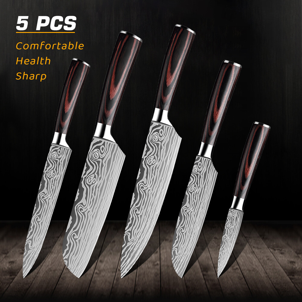 Set 5 Couteaux Japonais Cuisine Chef Professionnels Damas Acier Inox Carbone