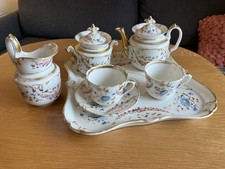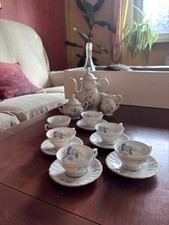 Service à thé de 12 piece avec ses tases, soucoupe et théière en porcelaine Le service à thé des décorations fleuris de couleur rose verte, dessus il y a aussi un oiseau de couleur bleu violet et vert, perché sur une branche avec des feuilles vertes et des bourgeons des papillons de couleur rose. Le bord supérieur de la tasse est doré