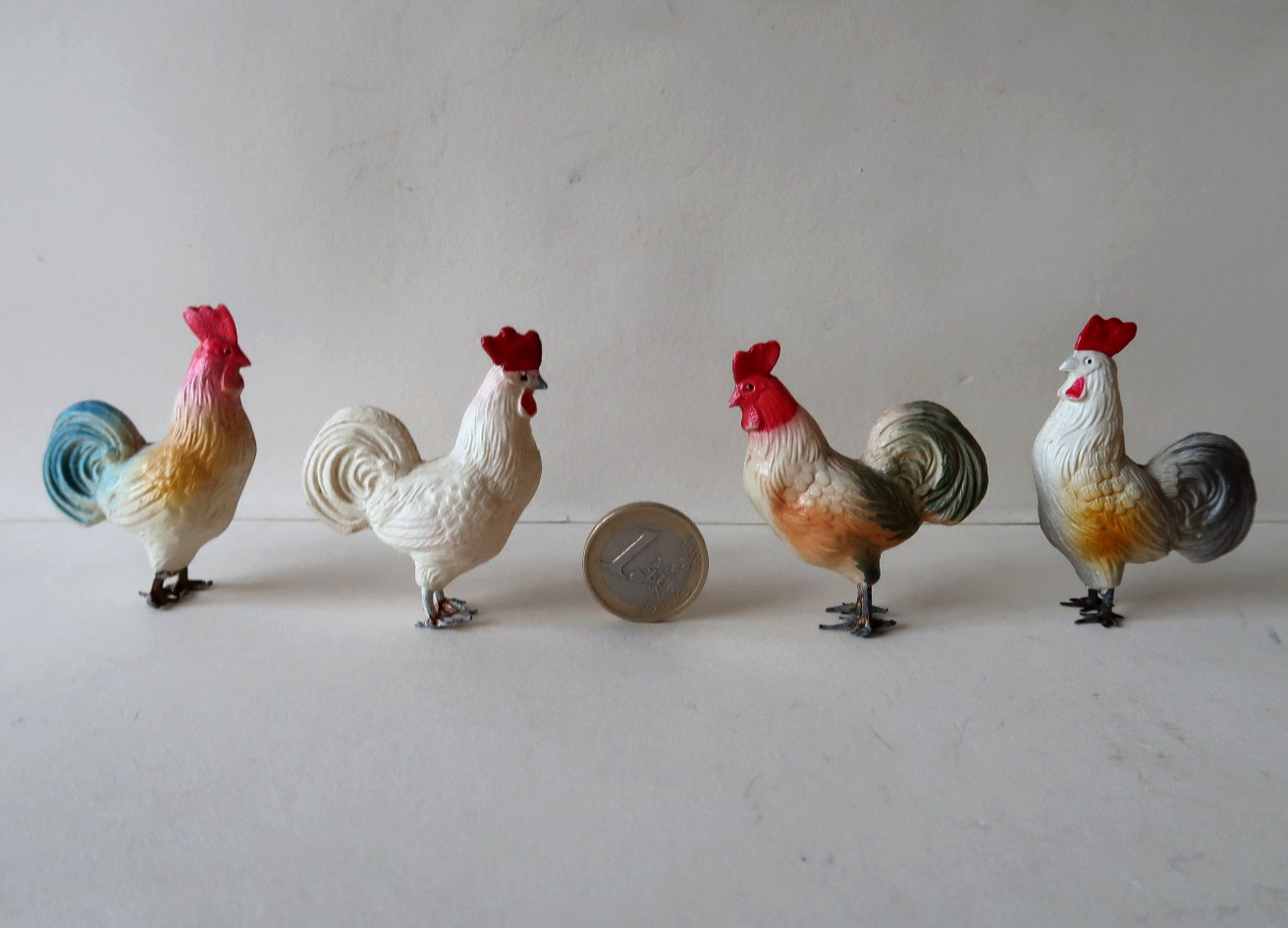 Set of 4 Celluloid animals, Rooster and Chicken. Allemagne ?., circa 1900. Avec pieds en plomb. Both are standing without help. Excellent condition, with nice colors.