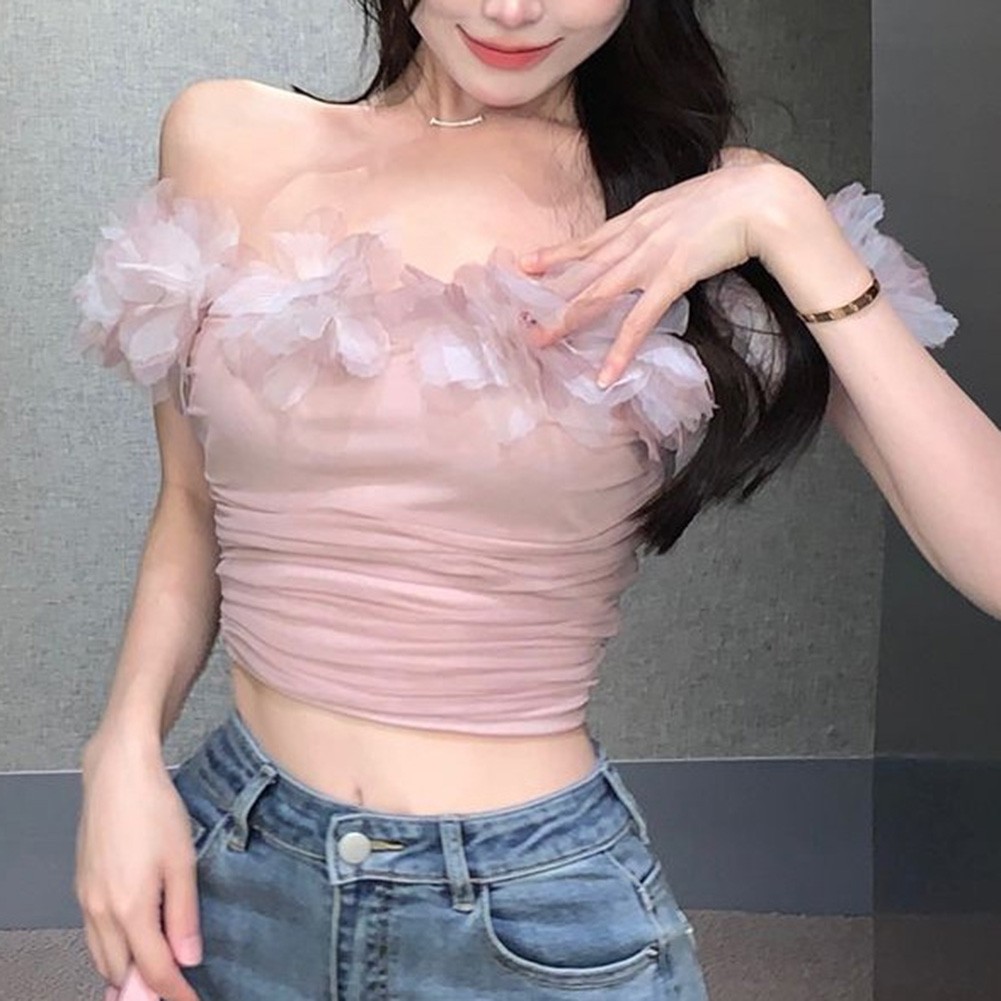 T-shirt femme été floral épaules dénudées avec manches courtes pour sorties