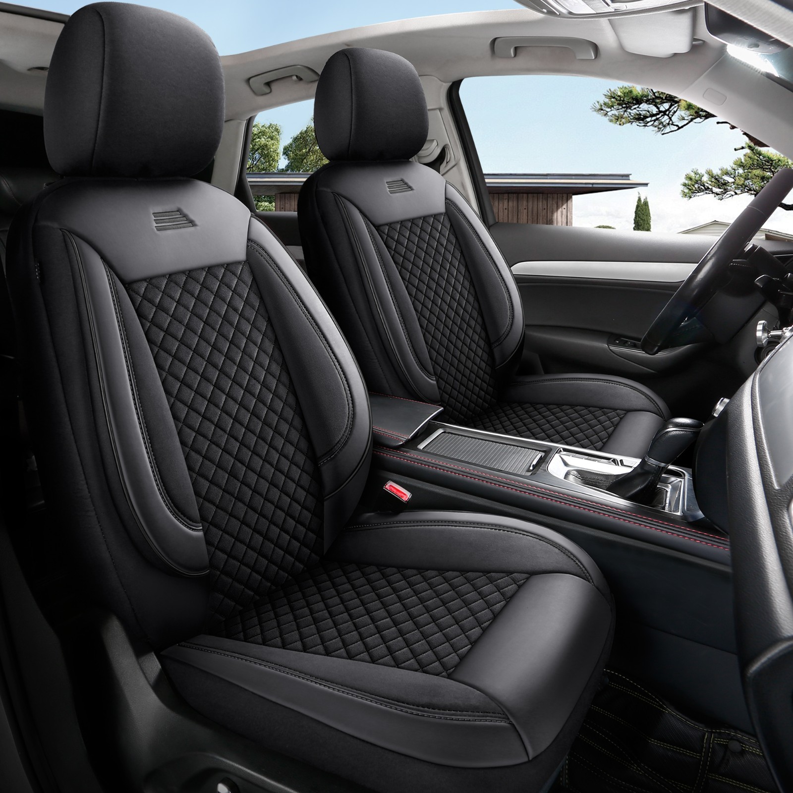Housses de siège auto AIM Premium - variantes. Housses de siège auto AIM Premium - Coutures noires/rouges, coutures noires/bleues, coutures noires/blanches, coutures noires/noires et similicuir noir.