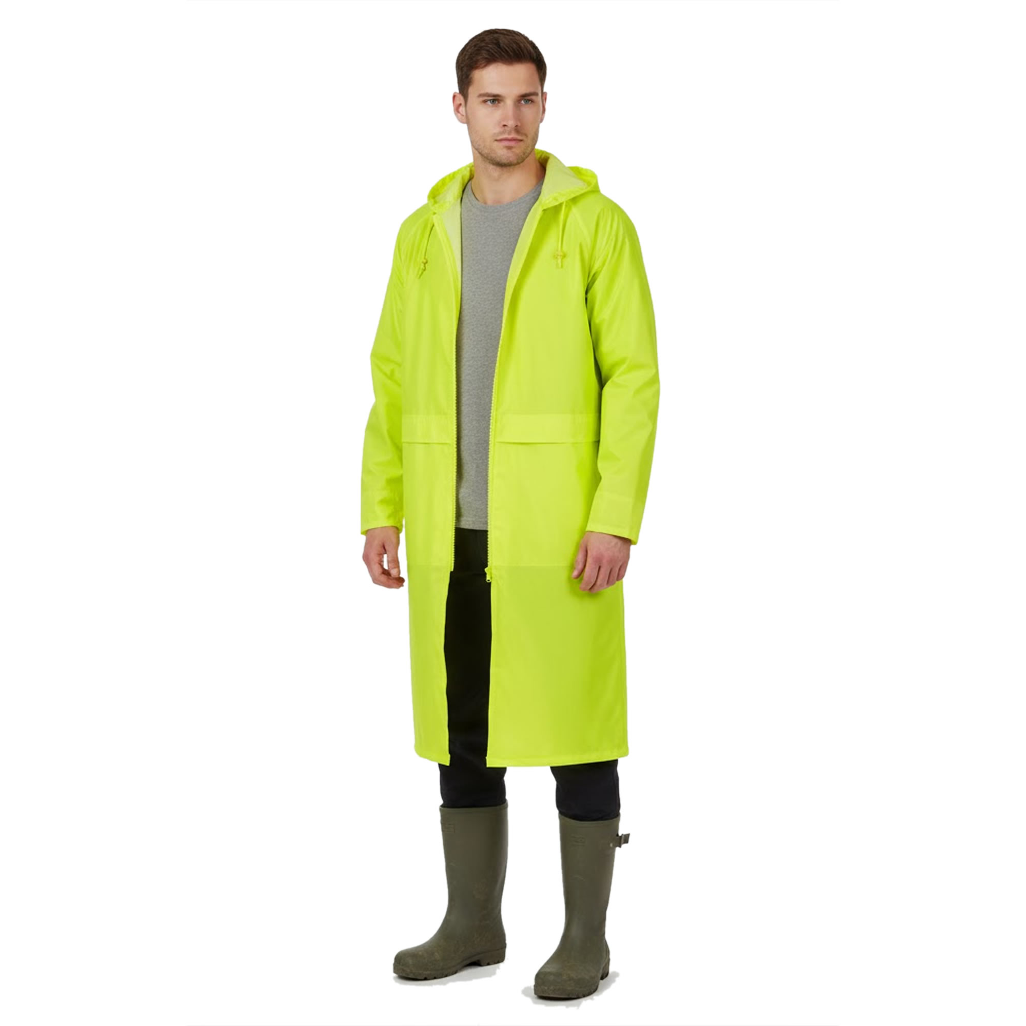 Manteau de pluie imperméable classique, long et léger, conçu pour offrir une protection exceptionnelle dans des conditions humides et venteuses. Il est fabriqué à partir d'un tissu en polyester avec un revêtement en PVC et comporte des coutures scellées pour empêcher la pénétration de l'eau. Protection imperméable : le tissu a une finition extrêmement résistante à l'eau, faisant déperler l'eau, et les coutures scellées offrent une protection supplémentaire. Il est certifié selon la norme EN 343 Classe 3:1 X pour les vêtements de protection contre la pluie. Design et confort : la longueur plus longue du manteau offre une couverture supplémentaire, tandis qu'un empiècement arrière ventilé et des œillets améliorent la respirabilité et le confort. Il a une coupe décontractée et généreuse pour.