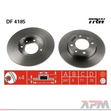 Axe de carrosserie: Arrière. Côté d'assemblage: Gauche/Droite. Diamètre du trou [mm]: 108.0. Diamètre du trou central [mm]: 71.0. Diamètre extérieur [mm]: 247.0. Disque avec roulement: Non. Fabricant: TRW. Hauteur [mm]: 35.0. Index: DF4185. Nombre de trous de fixation: 4.0. Numéro du fabricant: DF4185. Surface: peint. Type de disque: plein. Épaisseur [mm]: 9.0. Épaisseur minimale [mm]: 7.0.