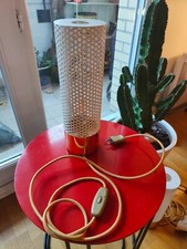Dimensions• Diamètre : 12 cm• Hauteur : 14,5 cmComposition• Abat-jour en verre• Base en plastiqueDescription• Verre épais strié• Pied cylindrique en plastique, coloris doré• Interrupteur sous le pied de lampe• Fonctionne avec 1 ampoule E14 fournie et 3 piles AAA non fournies