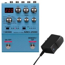 Boss MD-200 Modulation, Pédale d'effets, Pour guitare électrique, 12 modulations d'effets stéréo, Son stéréo de qualité studio 32 bits / 96 kHz, 4 emplacements de mémoire, Ecran LED, Contrôles: Rate, Depth, E.Level, Mod-Typ, Param 1,2 & 3, Tap, Memory, 2 commutateurs au pied, 2 entrées (A / Mono B) sur Jack 6,3 mm, 2 sorties (A / Mono B) sur Jack 6,3 mm, Entrée pour commutateur externe ou pédale d'expression sur Jack 6,3 mm, MIDI In/Out, Port USB, Fonctionne avec 3 piles AA, Bloc d'alimentation 9 V DC optionnel non-fourni (N° d'article #409939#), Consommation de courant: 225 mA, Dimensions (L x P x H): 101 x 138 x 63 mm, Poids: 610 g