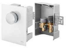 Oventrop Unibox contrôle de température de retour 1022770 pour une utilisation combinée dans des systèmes de chauffage avec fonctionnement par radiateur composé de: coffret mural avec vanne thermostatique préréglable limiteur de température de retour intégré Vanne de purge et de rinçage Isolation de la vanne Couvercle avec thermostat intégré pour l'intégration de la régulation de la température de surface dans les systèmes de chauffage central à circuits fermés pour fonctionnement avec non agressif liquides inoffensifs Max. Pression de service ps: 10 bar (PN 10) Température de fonctionnement ts: 2-100 ° C Plage de consigne: 7-28 ° C (température de retour) Couvercle avec volant intégré pour compensation d'angle et de profondeur Vanne avec raccord de tuyau G 3/4 selon DIN EN 16313 (cône européen) pour raccord à compression Couvercle en verre véritable: 155 x 210 x 6 mm Couverture blanche: 155 x 210 x 8 mm correspond à l'ordonnance sur les économies d'énergie EnEV