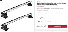 Pack complet pour Porsche Macan à partir d'Avril 2014, avec barres longitudinales intégrées.Le pack contient :- 2 barres de toit Thule ProBar Evo 135 cm- 4 pieds de toit Thule Evo Flush Rail Evo 7106- le kit de fixation Thule 6126 permettant l'installation du matériel.Toit avec barres longitudinales intégrées :Ces barres longitudinales sont intégrées au toit, aucun espace ne se trouvent entre elles et le toit du véhicule, a contrario des barres longitudinales ouvertes.Exemple de toit avec barres longitudinales intégrées :