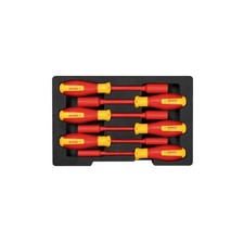 Set de 6 clés à douilles VDE Bosch Professional isolées, pratiques et faciles à utiliser, 7-14 mm Outils testés jusqu’à 10 000 V et certifiés VDE jusqu’à 1 000 V conformément à la norme EN/CEI 60900 Tête robuste et précise pour des serrages et desserrages parfaits Faciles à manier et pratiques à utiliser grâce à leur revêtement softgrip et à leur forme ergonomique Fonctions et principales caractéristiques SET DE 6 CLÉS À DOUILLE VDE PROFESSIONAL: INFORMATIONS COMPLÉMENTAIRES Points forts du produit En tant que professionnel, vous avez besoin d’outils faciles à utiliser, conformes à toutes les normes en vigueur. Le set de 6 clés à douilles VDE de Bosch Professional permet de serrer et desserrer des écrous hexagonaux, tout en étant protégé en cas de contact accidentel avec des pièces sous tension. Conformes aux normes en vigueur, ces outils disposent d’une isolation en élastomère thermoplastique (TPE). Ils ont été testés jusqu’à 10 000 V et sont certifiés VDE jusqu’à 1 000 V conformément à la norme EN/CEI 60900. Précises et endurantes, les clés à douille VDE disposent d’une tête robuste qui s’adapte parfaitement à la forme hexagonale des écrous. Leur revêtement softgrip et leur forme ergonomique les rend faciles à manier et pratiques à utiliser. La tige en acier S2 possède un revêtement protecteur isolant et le manche est recouvert de TPE en guise d’isolant. Les outils à main VDE de Bosch Professional répondent à toutes les exigences et bénéficient de la qualité Bosch éprouvée. Équipement et application Les clés à douille VDE de Bosch Professional disposent d’un profil anti-roulement les empêchant de rouler par terre. De plus, l’empreinte et la taille sont bien visibles à différents endroits du manche. Le set comprend 6 clés à douille VDE avec empreinte six pans mâle (7, 8, 10, 12, 13 et 14 mm) et tige de 125 mm de longueur. Le set inclut un calage demi-largeur compatible avec les L-BOXX du concept mobilité Bosch. >