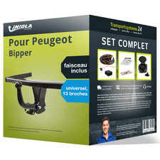Attelage prêt à monter, livré avec un faisceau universel + boitier électronique pour véhicule multiplexé en 7 broches.Facile à monter grâce à la notice de montage fournie (partie mécanique). Caractéristiques : Indications : Peugeot Bipper ; le perçage des longerons est obligatoire et l'ouverture des portes arrière peut être gênée par la tête de remorque Date de fabrication : 02/08- Type de rotule : Col de cygne démontable avec outil Masse remorquable : 1100Kg Masse statique : 60Kg Dépose du pare-chocs : Oui Découpe du pare-chocs : Pas de découpe Caractéristiques du faisceau : Type : Faisceau universel multiplexé 7 broches avec boitier électronique pour protéger l'ordinateur de bord du véhicule Compatibilité feux LED : Oui Passage à la valise : Non Longueur des fils : 3m de fils pour le montage du module, 5m de longueur pour le fil d'alimentation Cosse : Pré-montée sur le connecteur du boitier électronique Gestion des radars de recul : Non, désactivation manuelle via interrupteur au tableau de bord si le véhicule en est pourvu